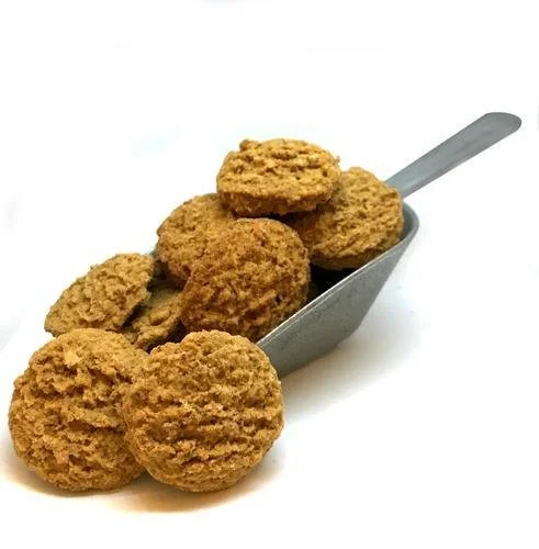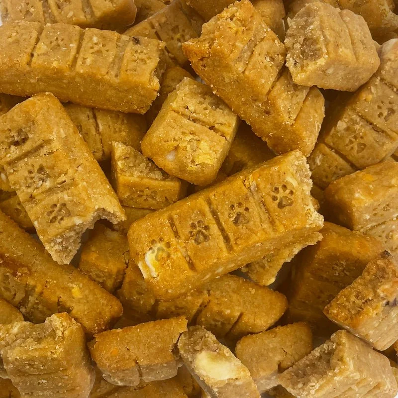 Some are soft and chewy (Blueberry Pancake, Bacon & Egg, Blueberry & Cranberry), others have a soft crunch (PB & Blueberry, Cheese & Bacon, Peanut Butter Cups). Enjoyed by dogs of all sizes. Find ingredients here.